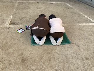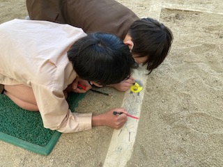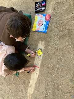 何をしているのかな?と思ったら、砂場のヘリに絵を描いています。立ち幅跳びの練習用の目印を描いてくれています!ありがとう!!