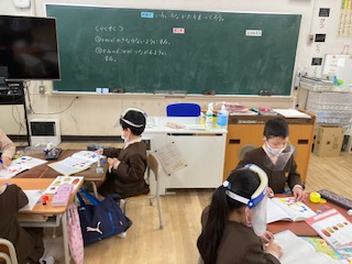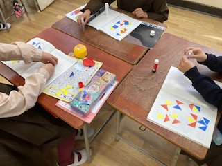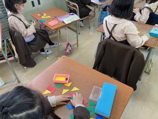 三角形の色板を使っていろいろなもようを作っています。教科書と同じ形を作るのも、向きを考えて置かないといけないので、ちょっと難しいところもあります。自分で考えて、動物や時計などを作りました。
