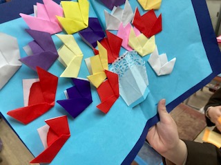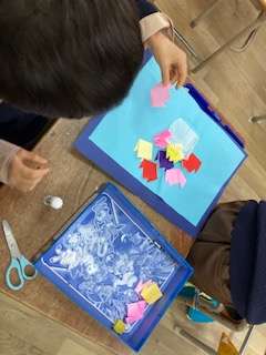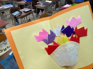 おうちの人へのプレゼントを作っています。たくさんの花と一緒におうちの人への感謝の言葉も飛び出すかもしれませんね。お楽しみに!