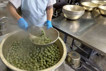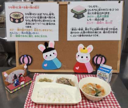 今日は、豚肉と野菜のいためもの、すまし汁、きな粉よもぎだんご、ごはん、牛乳でした。よもぎだんごはうるち米(米粉)ともち米を蒸してよもぎと混ぜて作ります。手作りの甘いたれを絡ませて子どもたちが食べる時にきな粉をかけて食べました。給食室では桃の節句にちなんだ掲示をしてくれています。