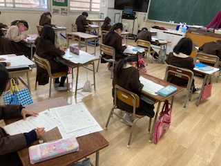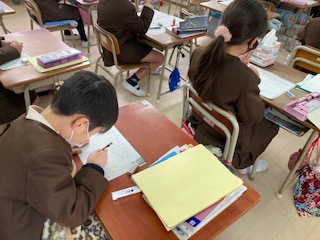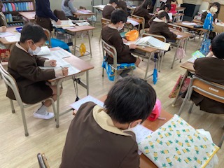 数枚の算数プリントが、後ろの配膳台の上に用意されています。自分で取りに行き、どんどん進めています。週に1回15分ですが、1年間積み上げると、大きな力となります。