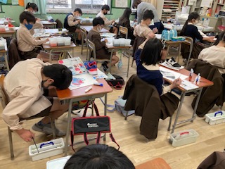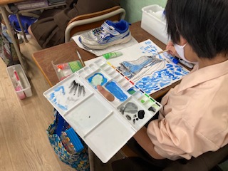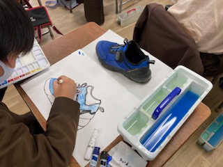 靴の線描が終わり、彩色をしています。よく見て細かく描いた線を生かして描いています。