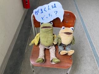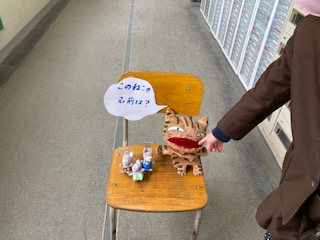図書室前の廊下にちょこんとキャラクターが座っています。「がまくんはどっち?」「このねこの名前は?」