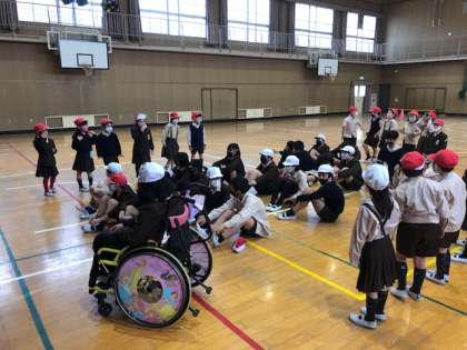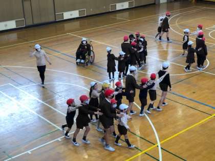 講堂で1年3組と6年3組が交流して遊びました。じゃんけん列車→おにごっこ→ドッジボールをしました。