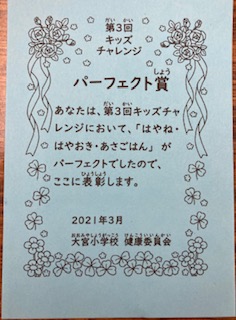 第3回「キッズチャレンジ」で「早寝、早起き、朝ごはん」が全て達成できた人に、健康委員会から表彰状を渡しました。全校で175名が達成できました!