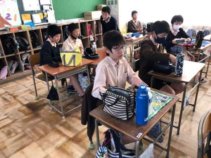 6年は、当初今日が卒業遠足の予定であったため、弁当を持参して教室で食べました。