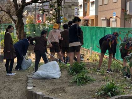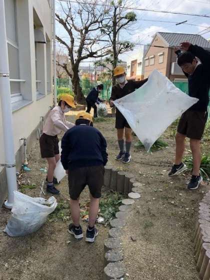 西校舎の裏の雑草や落ち葉を6年の有志でそうじしました。