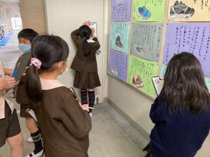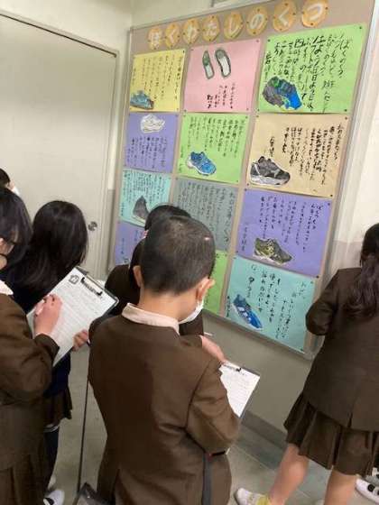 友達が描いた靴の絵の感想を書いています。良いところ、気に入ったところなどを見つけて、伝えます。