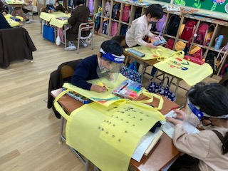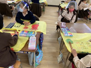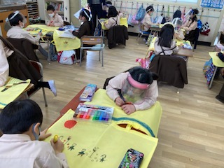 作品を持ち帰る袋に好きな絵を描いています。泣いたあかおにの絵を描いている子もいます。