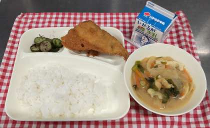 今日は、いわしのフライ、みそ汁、きゅうりの赤じそあえ、ごはん、牛乳でした。いわしは体をつくるたんぱく質、脳の働きを助けるDHA,血液の流れをよくするEPA,骨や歯を丈夫にするカルシウムをたくさん摂ることができます。小骨に負けすみんな丸ごと食べていましたよ。