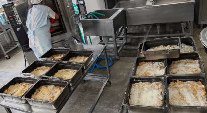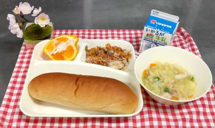 今日は、とうふのミートグラタン、押麦と野菜のスープ煮、デコポン、黒糖パン、牛乳でした。グラタンは小麦粉をふるってルウを作り、主材のとうふの他、牛ひき肉を減らして粒状大豆をプラスしヘルシーな仕上がりにしました。今が旬のデコポンは子どもたちにも人気の果物です。