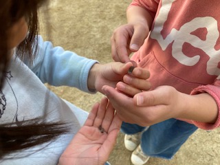 新1年生も体験で一緒に活動していました。ダンゴムシを見つけて、オスかメスか調べています。