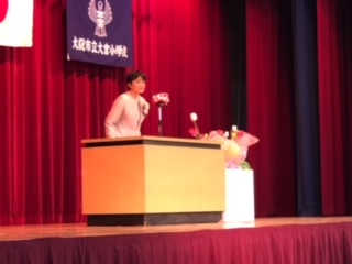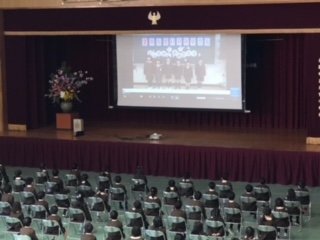 80名の1年生が、校長先生やPTA会長のお話をしっかり聞いたり、2年生によるの歓迎のビデオを視聴したりしました。