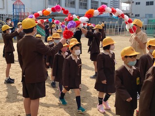 ちょっと緊張気味の1年生は、6年生の花のトンネルをくぐって整列しました。