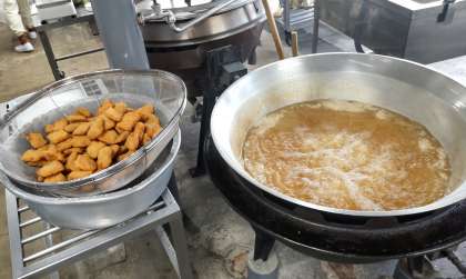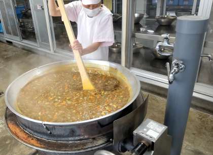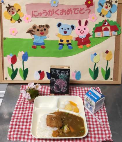 今日は、1年生のみなさんの入学と進級した皆さんをお祝いする豪華な献立です。子どもたちに人気のカツカレーライスには、可愛らしい形のラッキー人参も用意しました。ラッキー人参は「入っていたらラッキー」という食べる意欲が高まる取り組みです。これに、彩りキレイな「フルーツ白玉」を組み合わせました。
