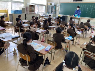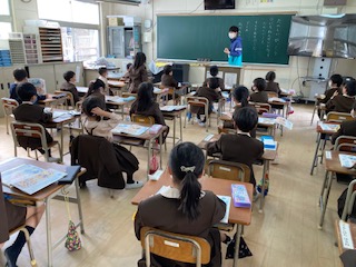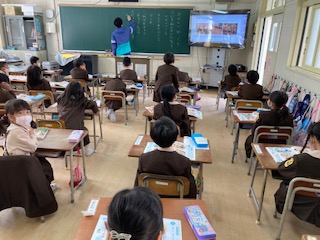 入学してから学校での楽しいことを発表しました。また、教科書の「対面式」の絵を見て、自分たちも経験したことを確認しました。先生が、ホームページの対面式の写真を見せると、「おんなじや!」と。