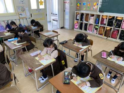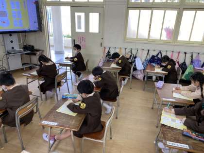 姿勢、持ち方、運筆など一つひとつ、ゆっくりていねいに学びました。線をなぞる時も、少しはみ出ると、きちんと消して書き直しています。