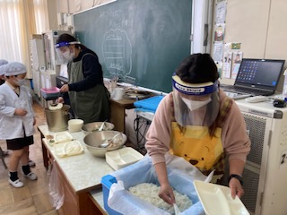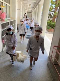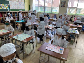 配膳をする間も静かに待っています。順番に列ごとに取りに行っています。