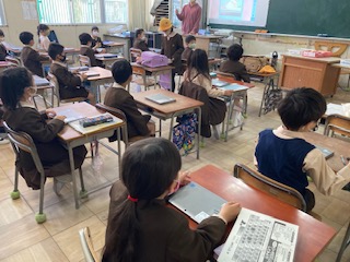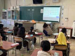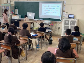 火曜日と木曜日の8時30分〜45分は、全校で英語タイムです。あいさつや天気、アルファベットなどを繰り返し行っています。