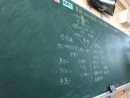 家庭の仕事にはどんなものがあるかを考え、みんなで交流しました。洗濯やそうじ、洗い物など本当にたくさんの仕事がある中で、おうちの人の役に立てるように自分でやってみたいことについて考えるよい機会となりました。