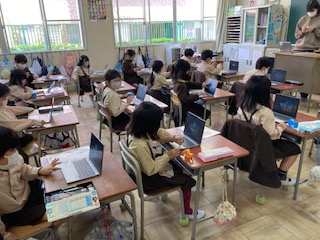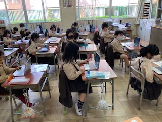1年生の時は、タブレットを使用していましたが、2年生からはノートパソコンを使います。6年生まで同じものを使うので、大切に扱います。まだローマ字は学習していませんが、ローマ字表を見て、入力練習をしています。