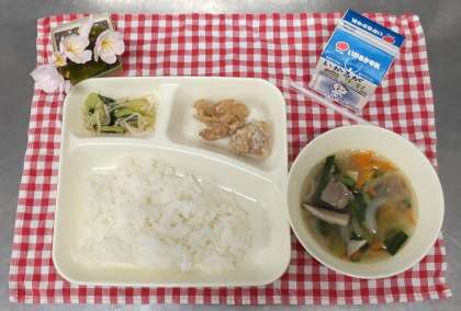 今日は、鶏肉のからあげ、中華スープ、チンゲンサイともやしの甘酢あえ、ごはん、牛乳でした。