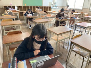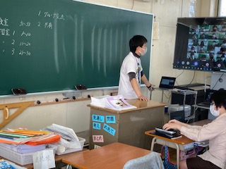 オンライン授業を想定し、4教室に分かれて学習をしました。テーマは、「東京オリンピックの開催についてどう思うか」です。6つのグループごとに話し合いをし、リーダーがまとめて発表しました。音声が聞き取りにくいグループは、チャット機能を使って自分の考えを書いて交流しました。「感染拡大が心配だから反対」という意見が多いようでした。