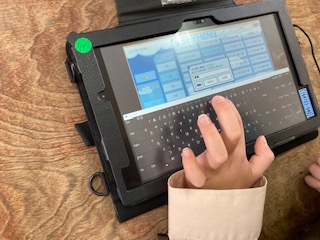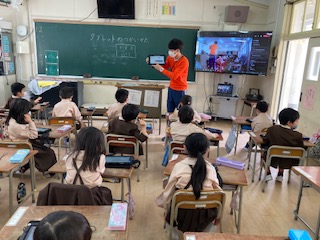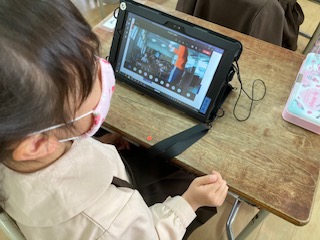 初めてタブレットパソコンを使いました。充電保管庫から自分で取り出して、電源を入れ、パスワードを入れて、teamsを立ち上げました。ゆっくり一つずつ前に映し出された映像を見ながら、やってみました。初めて手元の画面に、教室の様子が映った時は、みんな大喜びでした!もう少し慣れてきたら、家にも持ち帰ります。