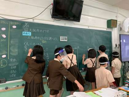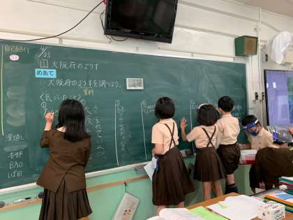 地形や大阪府の形の特徴を黒板に書き、共有することができました。
