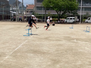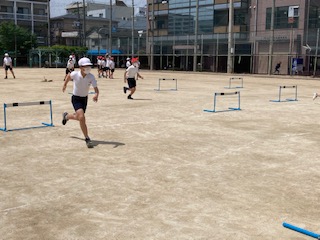ハードル走をしました。ハードルとハードルの間隔を自分に合ったコースを選び、フォームを意識しながら練習しました。暑さ対策のため、水分補給、休憩を十分とっています。