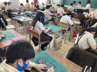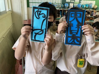 切り絵で自分の名前を入れたネームプレートを作っています。漢字やひらがなの文字をデザインして、工夫しています。オリジナルで、なかなかおしゃれですね。