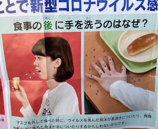 ウイルスを含んだ飛沫が食器や机、手などについているかもしれないので、それらを触った手で口元を触るとウイルスが体の中に入るからです。