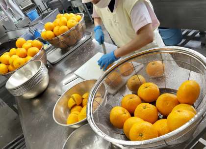 給食のシチューはルウも手作りです。小麦粉を乾煎りするところから丁寧に作ります。他に今が旬の甘夏かんも登場しました。一年生の中には、初めて食べる子も多く、ぶ厚い皮剥きにもチャレンジしていました。近年果物の摂取が減少しています。ビタミンたっぷりの果物はおやつにもおすすめですよ。