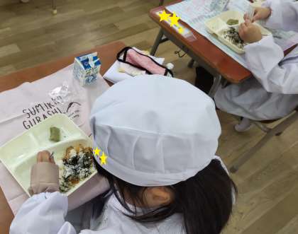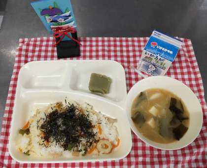 今日は、かやくご飯、みそ汁、まっ茶ういろう、牛乳でした。かやくご飯は給食室で作った具を教室で子どもたちがご飯と混ぜて自分でつくる混ぜご飯です。慣れていない1年生も上手にお皿の上で混ぜて作っていました。刻みのりの袋を開けるのが難しかったようですが、みんながんばっていましたよ。
