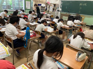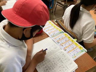内科検診の前の待ち時間。新しか習った漢字を使った言葉や文を作り、覚えています。