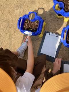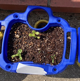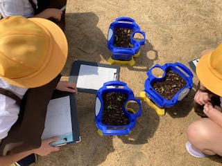 この前蒔いたマリーゴールド、ホウセンカ、ヒマワリの双葉が出ました。それぞれの違いを観察しました。