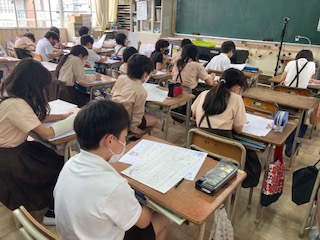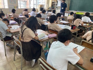 「ヤドカリとイソギンチャク」のテストをした後、自分たちも共生について調べたことをわかりやすくまとめるために、例文を読んで工夫を考えました。