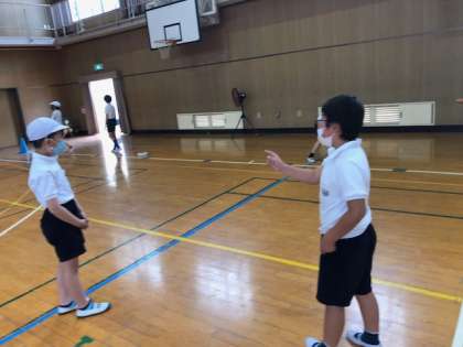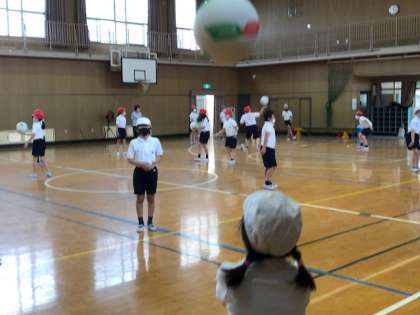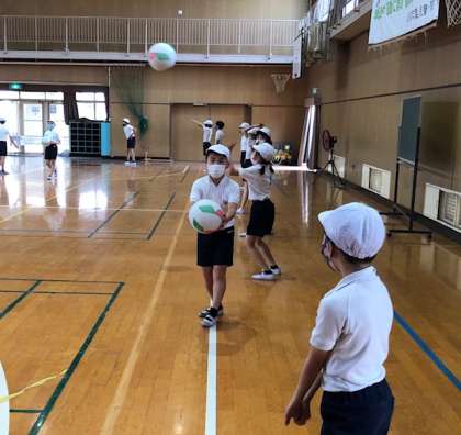 ソフトバレーボールを学習しています。アンダーハンドパスやオーバーハンドパスの練習のあと、4人組で何度も続ける練習をしました。力加減に気をつけて!和気あいあいと楽しそうです。