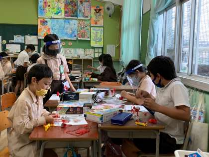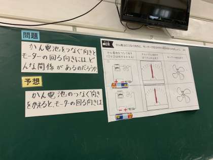 乾電池の向きとモーターの回る向きの関係を調べました。グループでいろいろ話しながら協力しあっています。