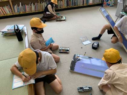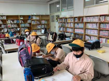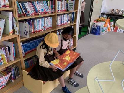 友だちと楽しそうに本を読み、読書ノートに記録しています。