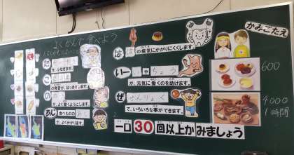 3年生の1クラスで「よくかんで食べよう」の学習をしました。「たこのあじはいーぜ」を頭文字にした噛むことによる良い働きを知り、1口30回以上かむための工夫を考えました。