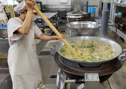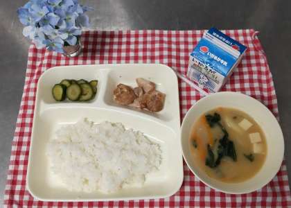 今日は、鶏肉のしょうゆバター焼き、小松菜のみそ汁、きゅうりのあえ物、ご飯、牛乳でした。給食のみそ汁は人気メニューの一つです。昆布と削り節で丁寧にとった出汁(だし)で大きな釜をつかってたくさんの具材を煮込んでいます。旨味たっぷりで美味しいですよ。