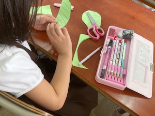 色画用紙で、アジサイの葉っぱを作りました。折り目をつけて線を書き、葉脈の模様もつけました。