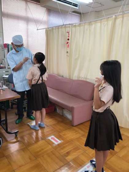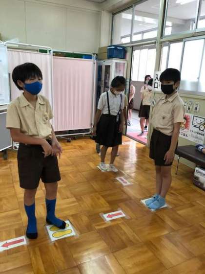 歯科検診を行いました。足型に並び、間隔を取りながら校医先生による検診の順番を待ちます。