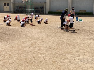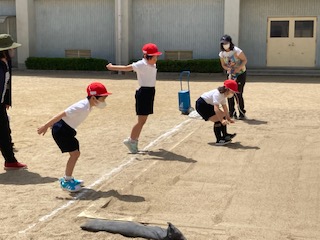 砂場で立ち幅跳びの記録をとりました。とても暑かったので、途中、木陰で休憩したりお茶を飲んだりしながら行いました。