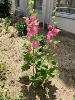 北校舎北側の植え込みに毎年咲くタチアオイ。梅雨入りの頃咲き始めます。