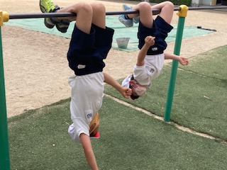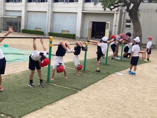 鉄棒のいろいろな技に挑戦しています。コウモリをしながらジャンケンをしたり、豚の丸焼きで後ろに進んだりと楽しんでいます。体育の時間、マスクはつけなくても良いことにしています。気になる子は、つけても良いことにしています。暑かったりしんどくなったりした時は、すぐに外すように指導しています。