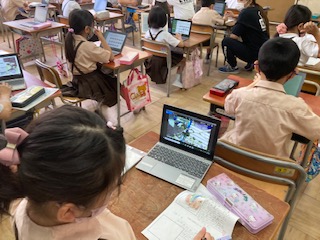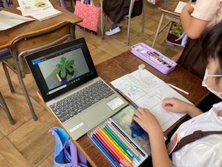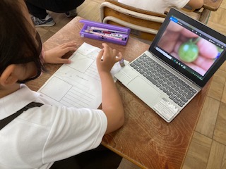 毎日、育てている野菜の観察をして、写真に撮っています。写真で確認しながら発見したことなどを野菜カードに描いています。ミニトマト、きゅうりの実ができてきました!匂いや手触りなどをしっかり書いてます。