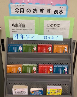 4年生で学習することわざや、故事成語に関する本を並べています。