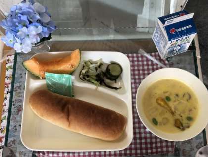 今日はかぼちゃのクリームシチュー、ミックス海そうのサラダ、クインシーメロン、コッペパン、りんごジャム、牛乳でした。年に一回登場するメロンは今が旬です。給食委員会が旬の食べ物について説明する動画を用意しました。